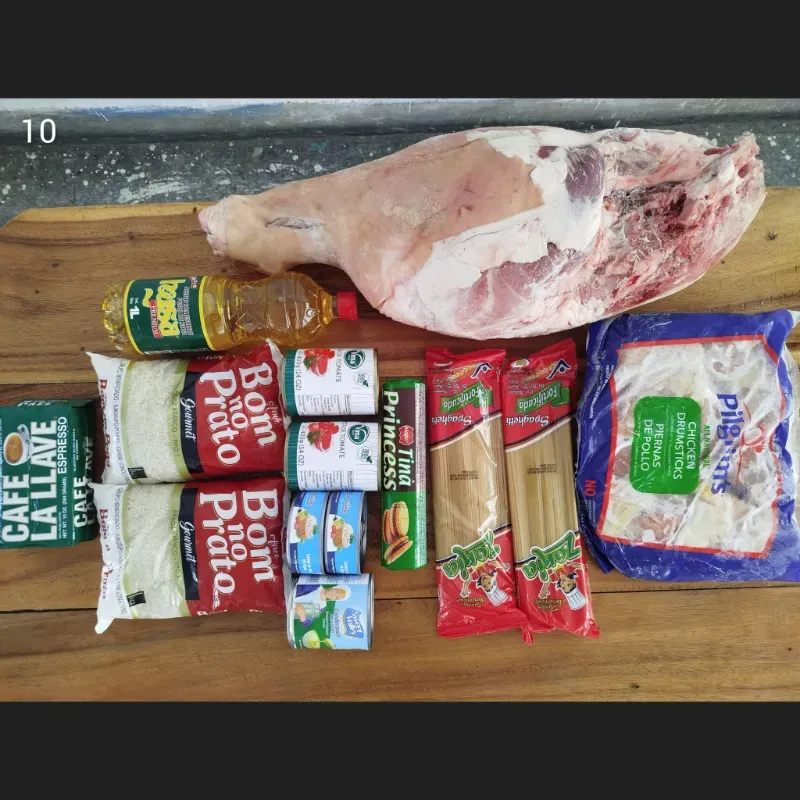 *Pernil (17-20lb) * 1 Pomo de aceite 1l *2 Bolsas de arroz 1kg * 1 Café * 2 Lata Atún 140g *2 Lata pasta puré tomate Vima 400 g * 1 Leche condensada *1 Galletas Dulces *2 Paquete de Spaguetis 500g * 1 Paquete de pollo 5lb Precio:110usd