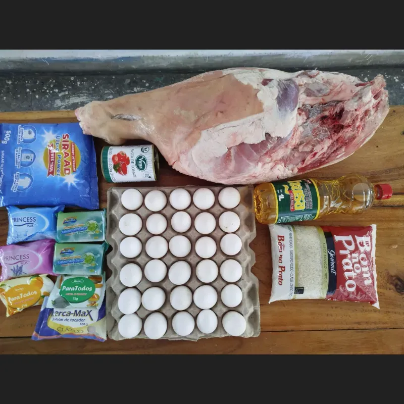 *Pernil (17-20 lb) * 1 Aceite 1l * 30 huevos * 1 Bolsas de arroz 1 kg *1 Lata puré Vima 400g * 5Jabon de baño 100g * 2 Jabón de lavar * 1 Paquete de detergente 500g Precio:90usd