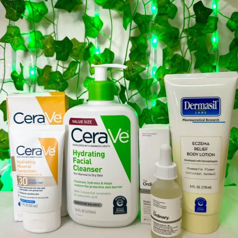Protector solar mineral + Limpiador Facial Hidratante Cera ve + Serum de ácido hialuronico The ordinary + Crema Dermasil