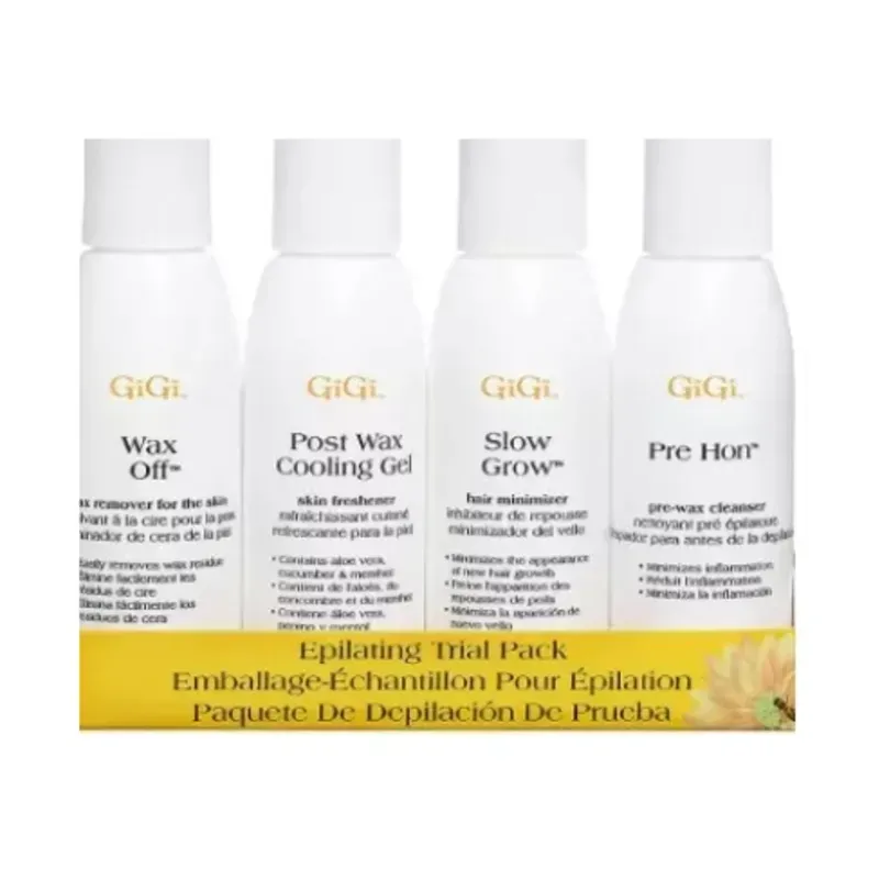 Este paquete de prueba contiene cuatro tratamientos de cera de 2 onzas: Pre Hon (limpiador de precera) Wax Off (después del removedor de cera) Gel de enfriamiento Post Wax (ambientador de piel) Slow Grow (minimizador de cabello).