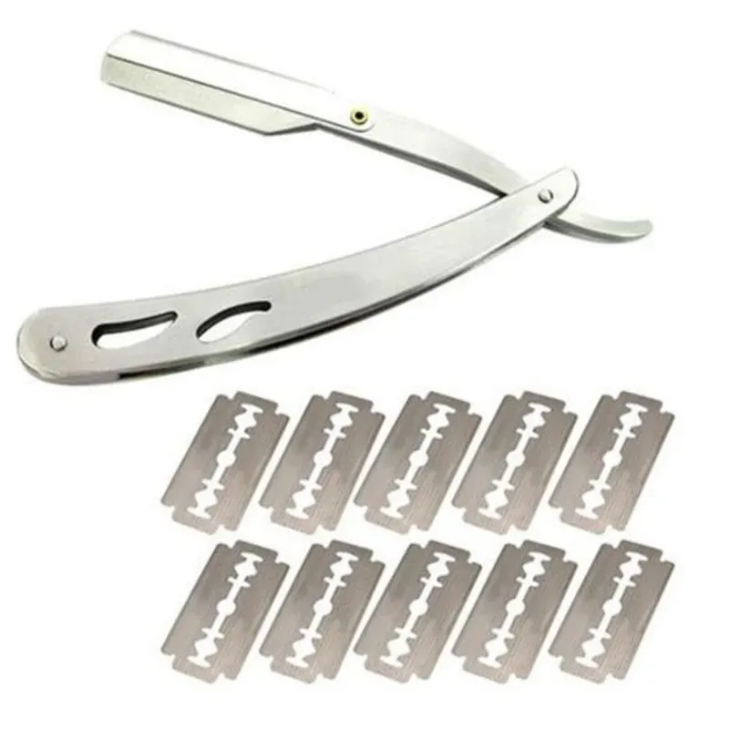 Navaja de afeitar recta de soporte. Es ideal para peluquería. De Material de acero inoxidable + 10 cuchillas.