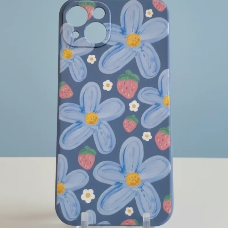 Cover de goma azul con diseño de flores y fresas y protección alrededor de las cámaras