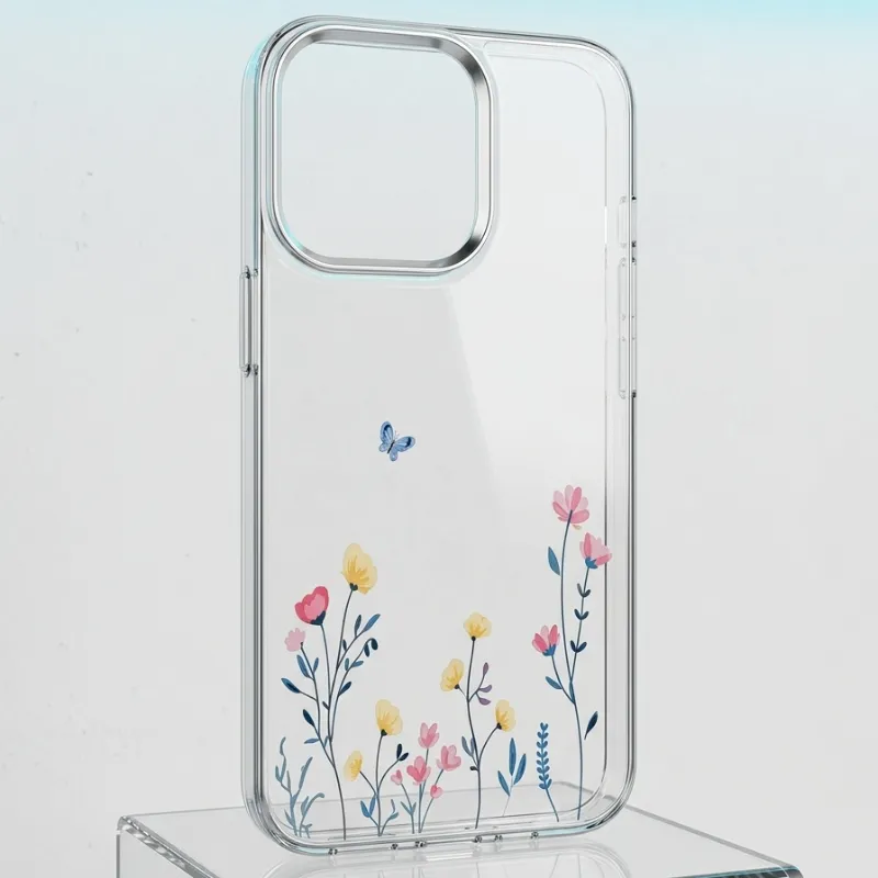 Cover de silicona transparente con diseño de flores y mariposas y detalles en plateado