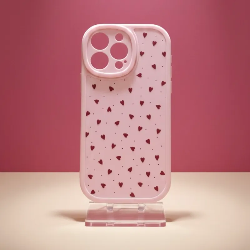 Cover de goma antichoque rosado con diseño de corazones y protección alrededor de las cámaras