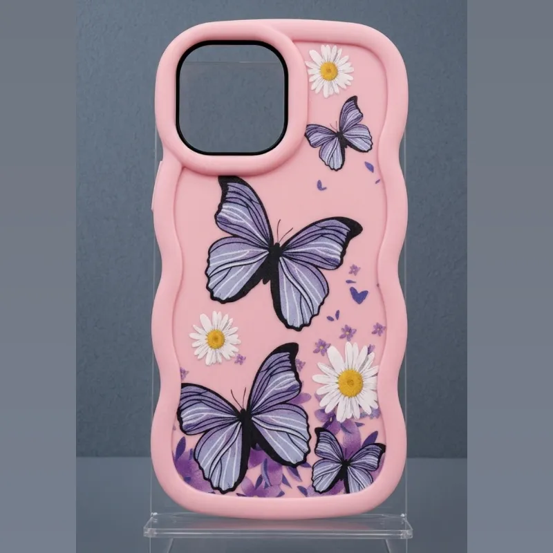 Cover de goma rosa antichoque con diseño de mariposas moradas y margaritas