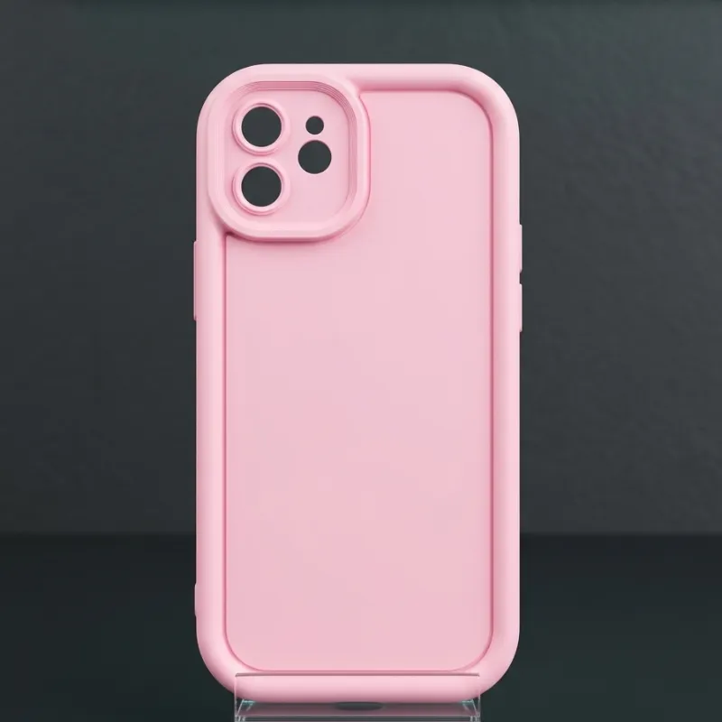 Cover de goma antichoque color rosa pastel claro con protección alrededor de las camras