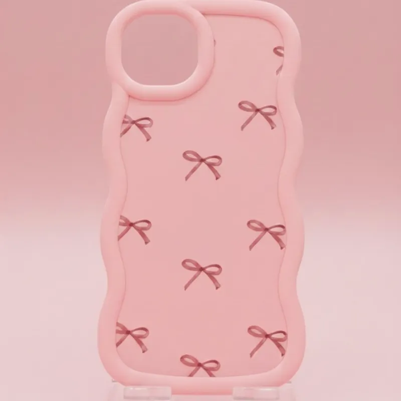 Cover de goma antichoque en color baby pink con diseño de lazos rosa