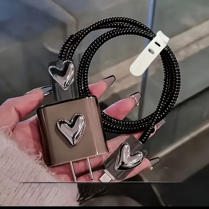 Protector de cargador en color negro con corazón a relieve en color plateado