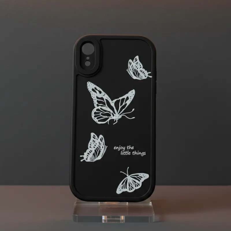 Cover de goma antichoque con protección alrededor de las camras y diseño de frase blanca y mariposas