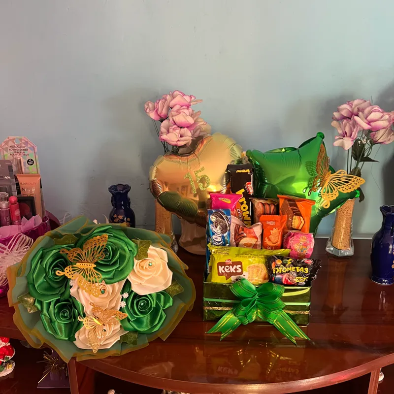 Caja de chuches y ramo pequeño