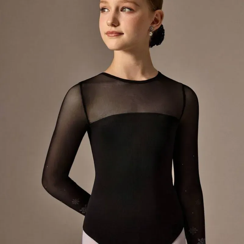 Leotardo de activewear para niñas preadolescentes, adecuado para ballet, vuelta al colegio, entrenamiento en el campus, entrenamiento, competición, uso casual. Diseño de manga larga con malla elástica y con estilo, ropa deportiva de danza cómoda y elástica.