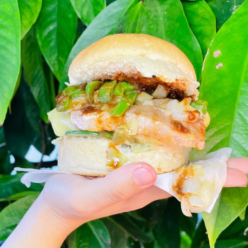Hamburguesa(220g), vegetales de estación, queso gouda, lomo ahumado, cebolla, pimiento.