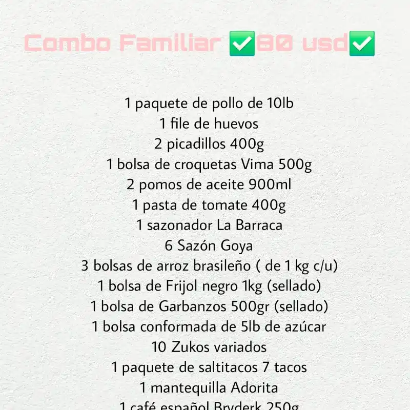 Cárnicos y otros congeladosEmbutidos Aceites y grasas Pastas, granos y cereales Café ☕️ y Chocolates 🍫 Legumbres Snacks, confituras y galletas. Aseo, limpieza y Cuidado personal Productos enlatados Bebidas alcohólicasAgua, refrescos, y otras bebidas no alcohólicas Condimentos y especias Lácteos Azúcares Sopas y salsas Electrodomésticos Teléfonos celulares CombosProductos variados