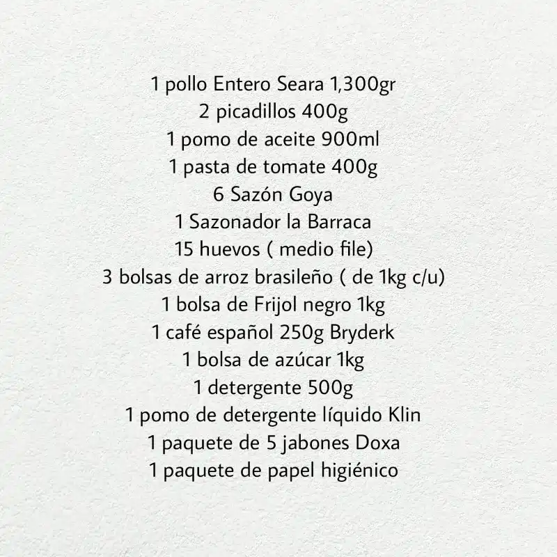 Cárnicos y otros congeladosEmbutidos Aceites y grasas Pastas, granos y cereales Café ☕️ y Chocolates 🍫 Legumbres Snacks, confituras y galletas. Aseo, limpieza y Cuidado personal Productos enlatados Bebidas alcohólicasAgua, refrescos, y otras bebidas no alcohólicas Condimentos y especias Lácteos Azúcares Sopas y salsas Electrodomésticos Teléfonos celulares CombosProductos variados