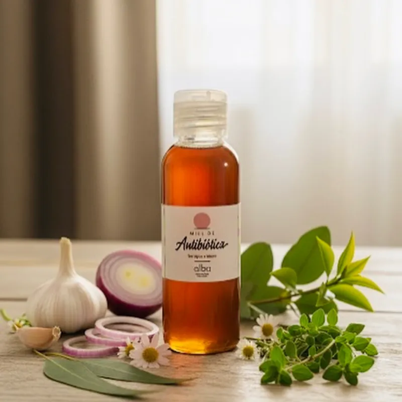 Miel Antibiótica 113g Uso tópico e interno. Producto enriquecido con ajo y cebolla morada, orégano y árbol de té de cultivo ecológico. Propiedades antibióticas, antiinflamatorias.