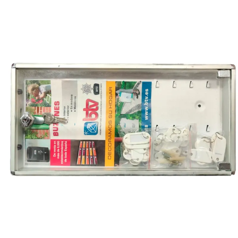 • Portallaves estilo industrial con capacidad para 22 unidades. • Diseño moderno horizontal. • Estructura de aluminio color plateado con puerta de metacrilato transparente de alta resistencia. • Tablero trasero con chapa reforzada color blanco. • 2 llaves de seguridad. • Tiene 2 orificios para fijar a la pared. • Incluye 4 tornillos expansionadores para su instalación. • Incluye 22 llaveros identificadores color blanco.