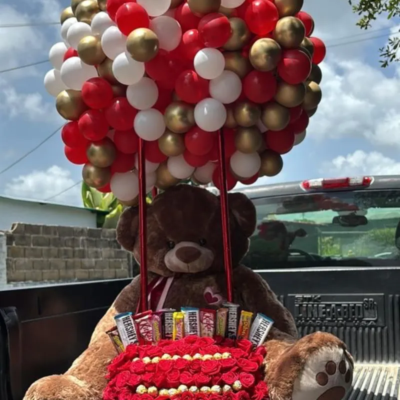 Arreglo grande de globos y floral 50 rosas 24 bombones Ferrero Peluche de 1 metro 10 hershey’s 1 cajita de galleticas Oreo