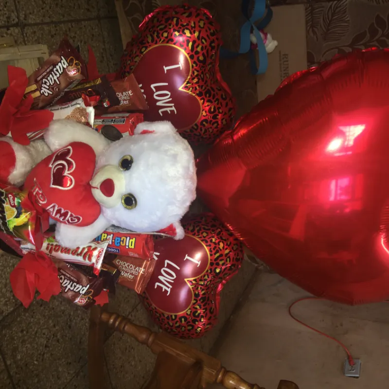 Cesta en forma de corazón decorada con globos confituras y peluche tamaño mediano
