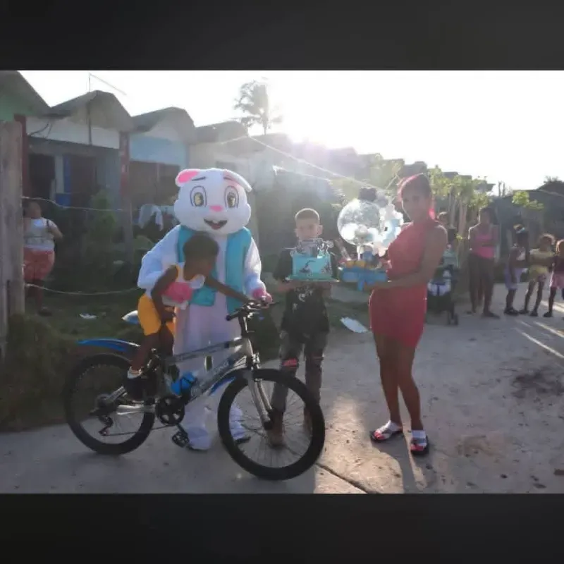 Sorpresa de cumpleaños de una abuela a su nieto q lo ama. Bicicleta 20 mas pastel con tematica de futbol y regalo persoanlizado todo esto entregado por el Conejo de Pascua