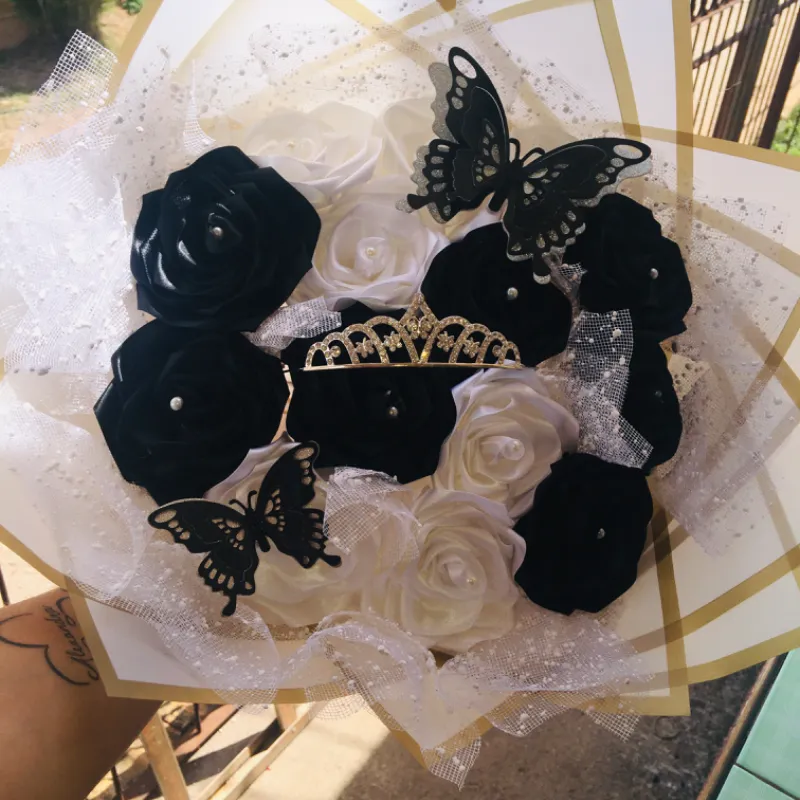 Ramo de rosas blancas y negras con corona especial para regalar en cumpleaños