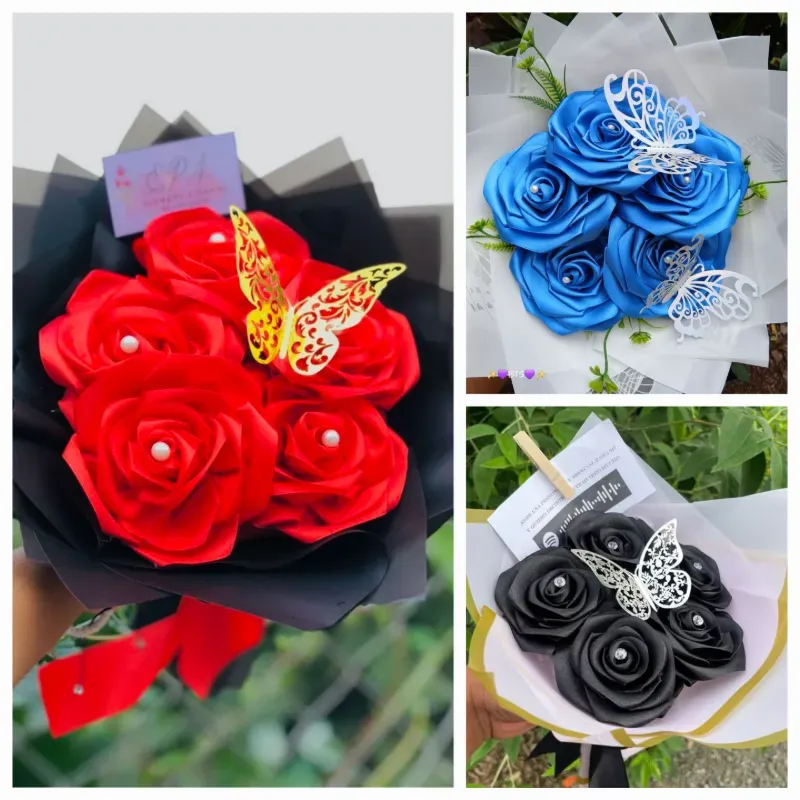 🎀 Este ramo contiene en su interior 5 rosas de satín e incluye 1 figura decorativa (Mariposa / Corona)...