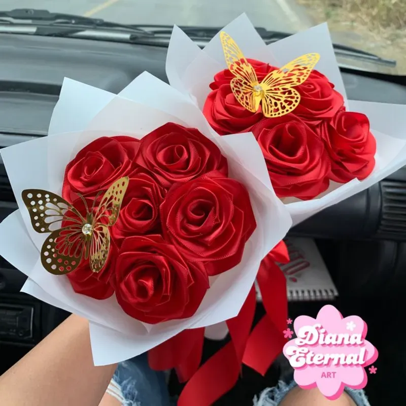 🎀 Este ramo contiene en su interior 6 rosas de satín e incluye 1 figura decorativa (Mariposa / Corona)...