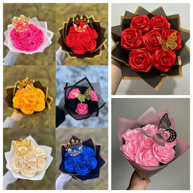 🎀 Este ramo contiene en su interior 7 rosas de satín e incluye 2 figuras decorativa (Mariposa / Corona)...