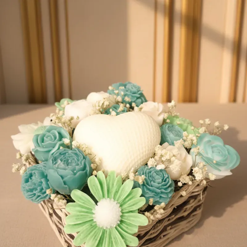 Un arreglo de velas decorativas inspirado en la belleza de un jardín en flor. Cada detalle está pensado para transmitir delicadeza, convirtiéndolo en un regalo especial o un elemento decorativo único.