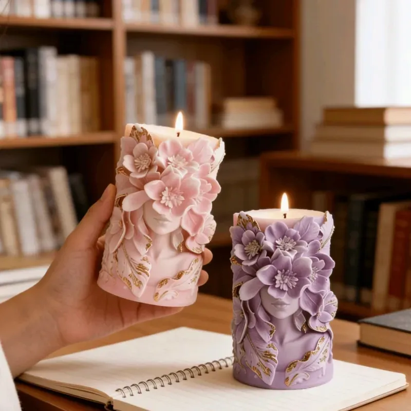 Vela con relieve de flor elegante de diosa con decoración dorada, adecuado para decoración romántica del hogar y regalos