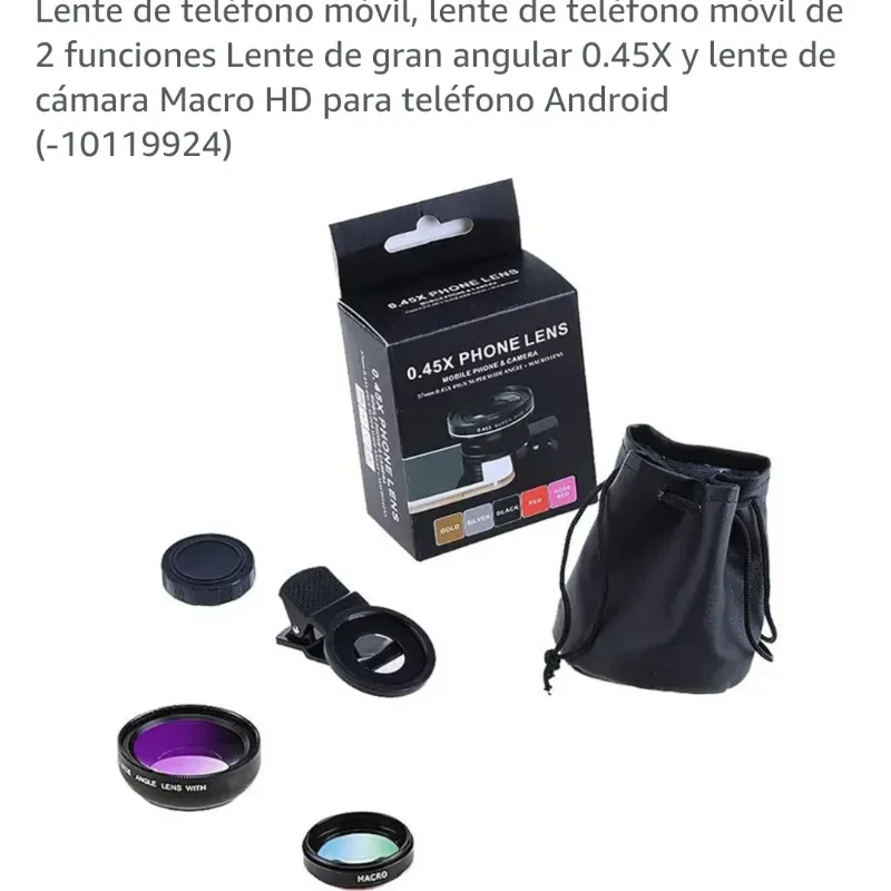 Color: Negro. Lente para teléfono movil de 2 funciones. Lente de gran angular 0.45X y lente de cámara Macro HD.
