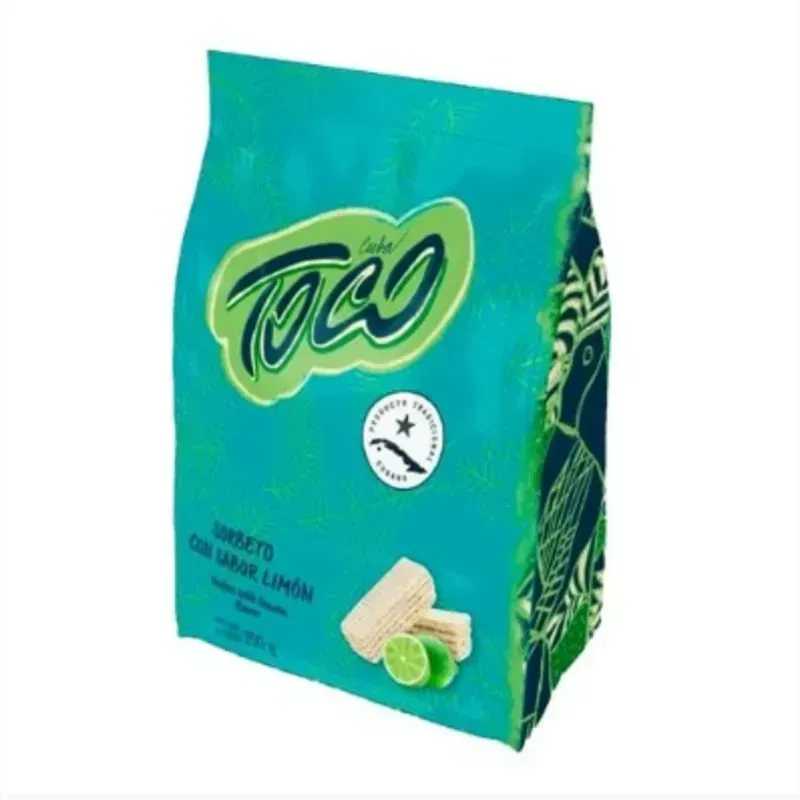 Sorbeto Toco sabor limón (250 g). Producidos por la empresa mixta Proxcor SA desde el año 2020, a partir de materias primas de excelente calidad, elaborados con recetas de maestros reposteros de Caibarién, quienes diseñaron una oblea que crea recuerdos inolvidables a tus seres queridos.