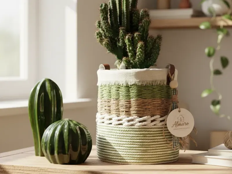 Cestas tejidas con hilo de yute y estambre, forradas en linzo o tela de color especifico. Agarraderas de cuero fijadas con tachuelas. Colgante decorativo Dimensiones: Diametro 15 cm Altura 10 cm