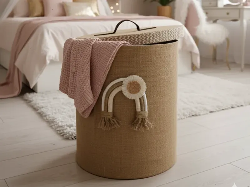 Cesto con cartón reforzado específico para ese tipo de trabajo. Forrado con tela arpillera (Yute). Tapa con agarradera de cuero fijada con tachuelas. Decoración con hilo de yute, lana, soga de yute, punta de yute.