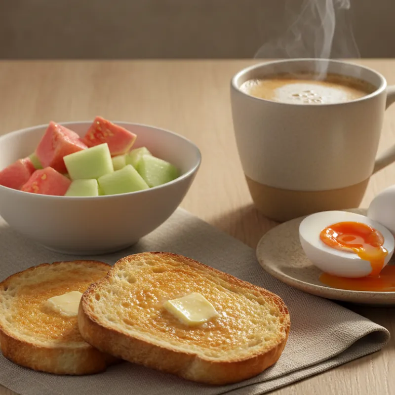 Comienza tu día con nuestro desayuno Amanecer Mulato, una opción completa y deliciosa. Incluye tostadas con mantequilla, una taza de café, un bowl con dos tipos de frutas naturales y un huevo al gusto.