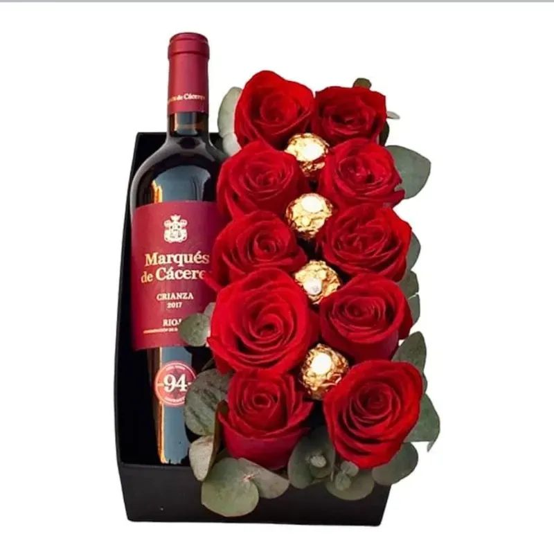 Caja con bebida rosas y bombones