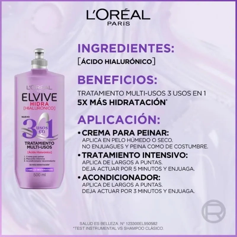 • Fórmulado con Acido Hialurónico • 5x veces más hidratación • Para cabello deshidratado. Nuestro Tratamiento Multi-usos 3 usos en 1 Hidra Hialurónico es tu aliado para 5X más hidratación sin dejar el cabello pesado, puedes usarlo para: Hidratar y estilizar como una crema para peinar Transformar y suavizar como una mascarilla intensiva Desenredar como un acondicionador Ahora puedes realizar tus compras de este y otros productos en tu tienda en línea, donde encontrarás lo necesario para tu día a día, disfruta de una gran variedad de articulos de higiene y belleza personal. Recuerda que, con nuestro servicio de entregas a domicilio, tus compras llegarán hasta la puerta de tu hogar.