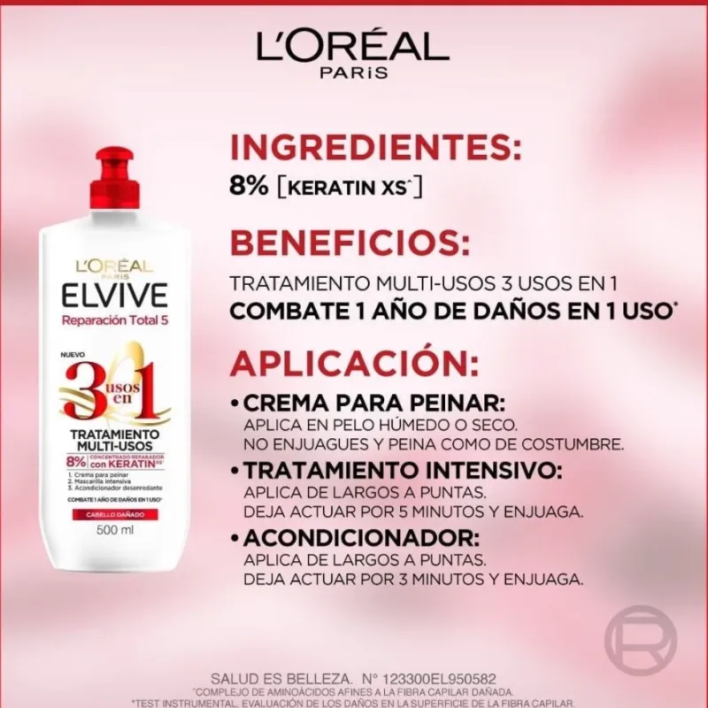 • Reconstructor con KERATIN xs y sin sal • Reparar el pelo dañado • Para combatir 1 año de daños en 1 uso. Nuestro Tratamiento Multi-usos 3 usos en 1 Reparación Total 5 para combatir 1 año de daños en 1 uso*, puedes usarlo para: Reparar y estilizar como una crema para peinar Transformar tu cabello como una mascarilla intensiva Desenredar como un acondicionador Ahora puedes realizar tus compras de este y otros productos en tu tienda en línea, donde encontrarás lo necesario para tu día a día, disfruta de una gran variedad de articulos de higiene y belleza personal. Recuerda que, con nuestro servicio de entregas a domicilio, tus compras llegarán hasta la puerta de tu hogar.