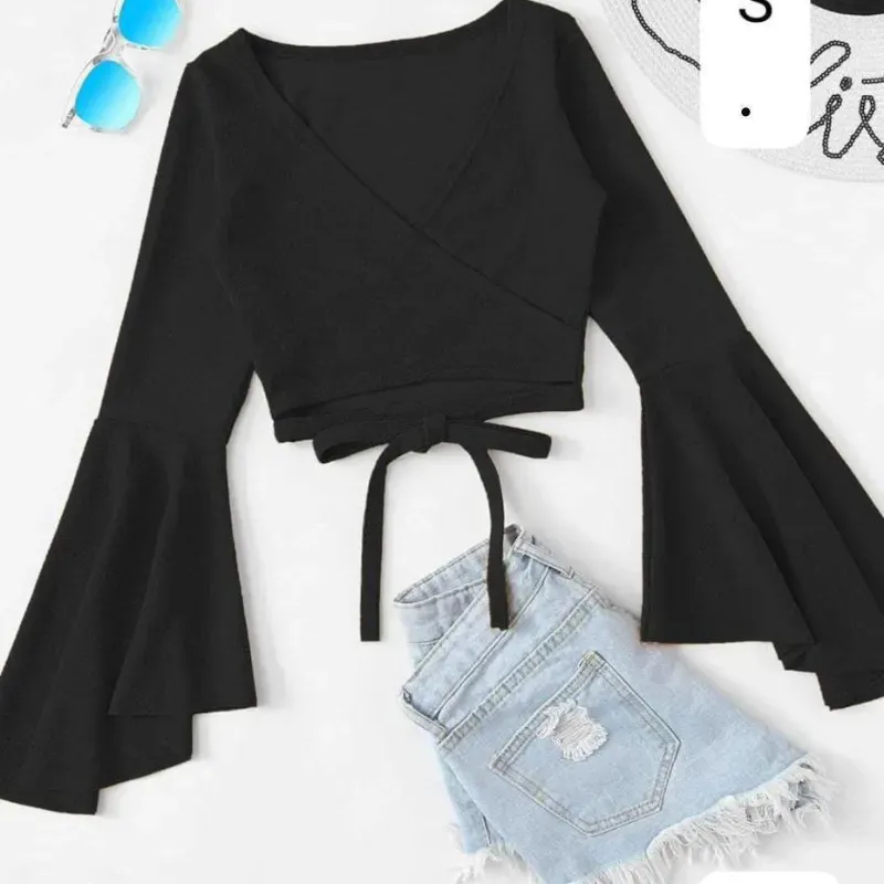 Blusa corta de diseño cruzado frontal con lazo ajustable a la cintura. Destaca por sus mangas acampanadas XL que aportan movimiento y estilo. Escote en V pronunciado y tejido suave con caída. El equilibrio perfecto entre audacia y elegancia. Precio: 18 USD.