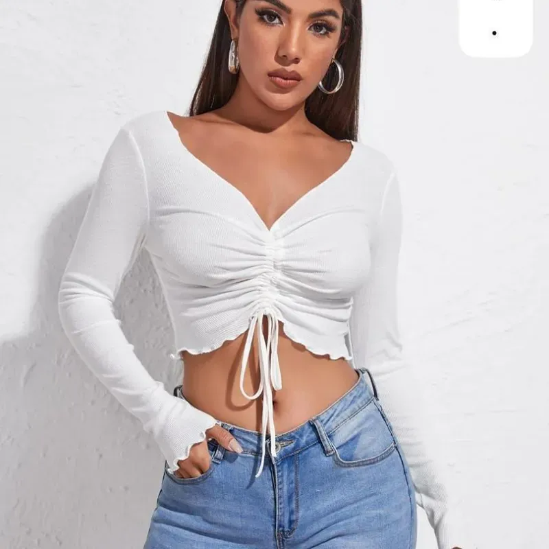 Este crop top blanco es la pieza que tu clóset necesita para crear looks dinámicos. Su gran diferencial es el fruncido frontal mediante cordón ajustable, que te permite decidir qué tan pronunciado quieres el escote y qué tan corta prefieres la prenda.