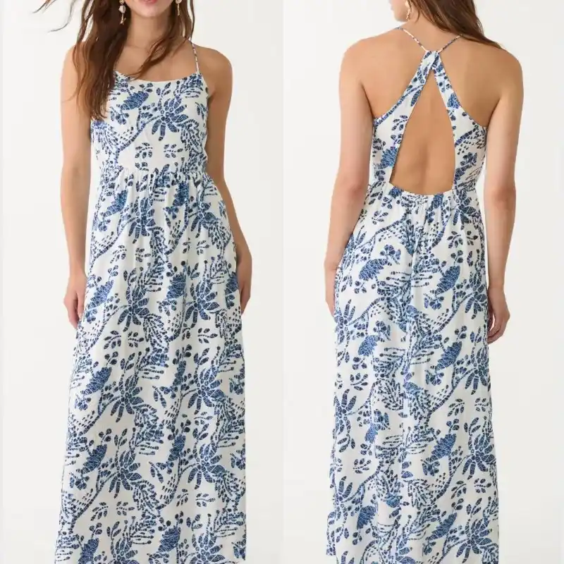 Elegante vestido largo con estampado floral en azul sobre fondo blanco. Destaca por su espalda descubierta con tirantes cruzados y corte fluido que aporta movimiento. Ideal para días calurosos y eventos casuales junto al mar. Precio: 33 USD. Talla: S.