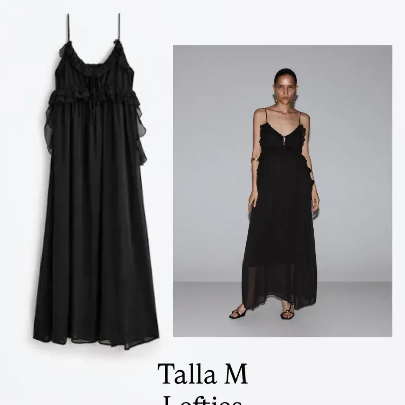 👗✨️Vestido Maxi Lefties Negro Vaporoso — Diseño de Tirantes con Volantes y Transparencias — Talla M