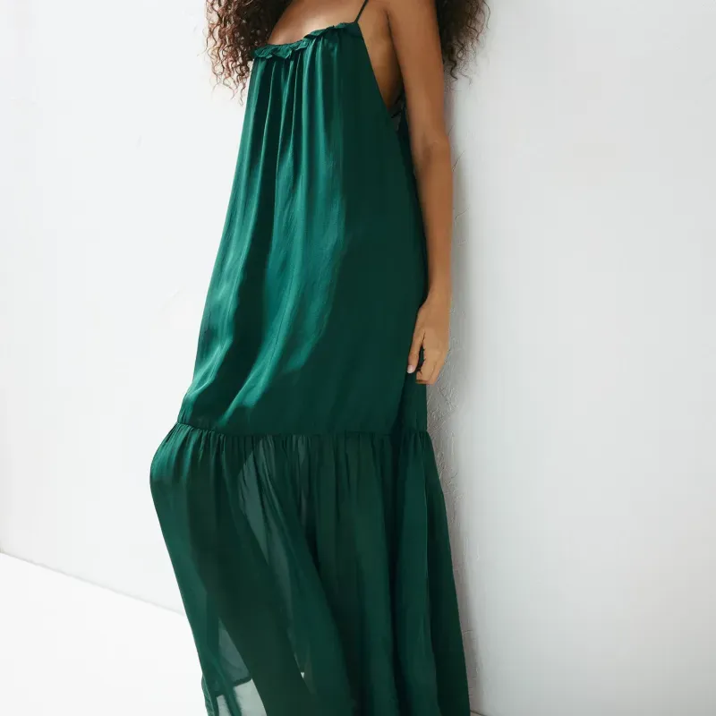💚✨️Vestido Maxi Pull&Bear Verde Esmeralda — Diseño Vaporoso con Tirantes Finos y Volante — Talla M