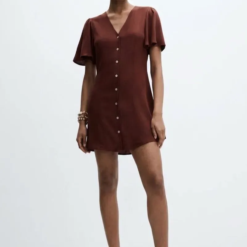 🤎Vestido Mini Chocolate de Corte Evase — Diseño con Botonadura Frontal y Mangas de Vuelo — Talla M