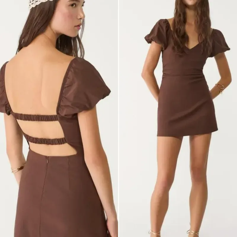 👗Vestido Mini Marrón Stradivarius con Mangas Abullonadas y Espalda Descubierta Estilo Cutout - Talla M