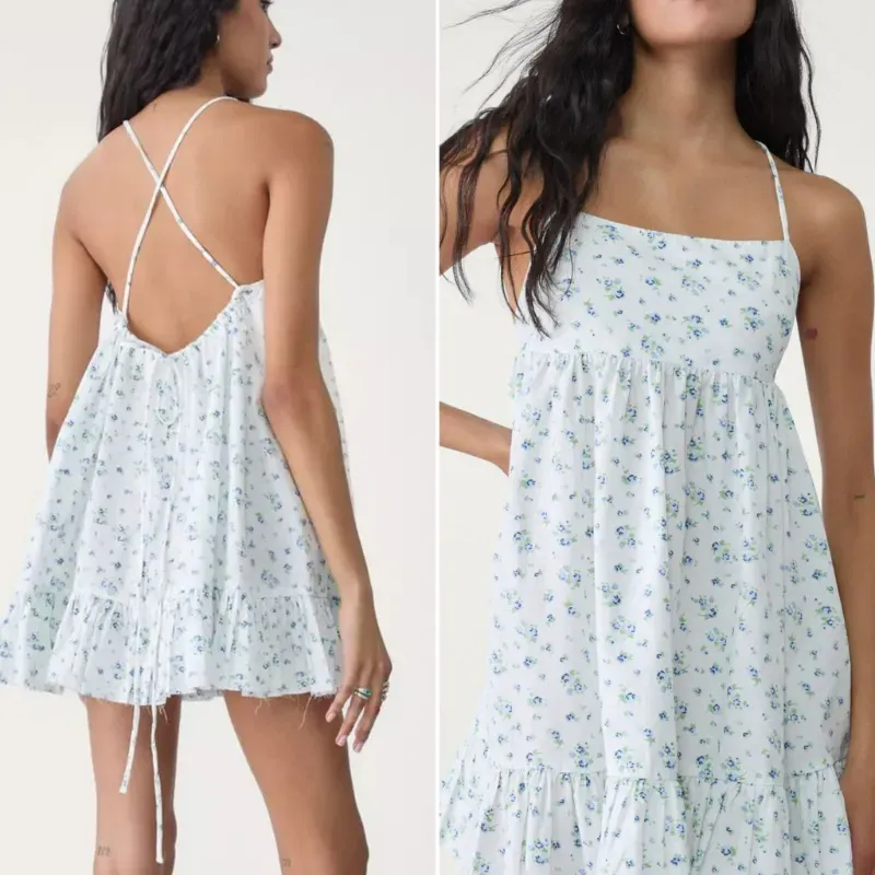 👗🤍Vestido Mini Stradivarius Floral — Estilo Babydoll con Espalda Cruzada y Volantes — Talla M