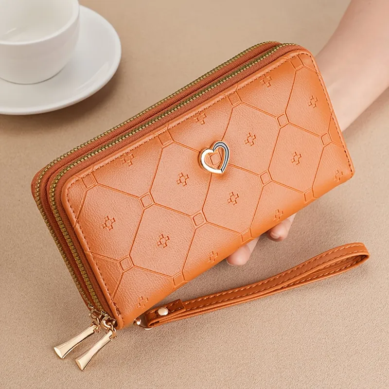 Esta billetera de pulsera larga para mujer de Shein presenta un diseño de doble cremallera con múltiples ranuras para tarjetas y un detalle De corazón disponible en varios colores