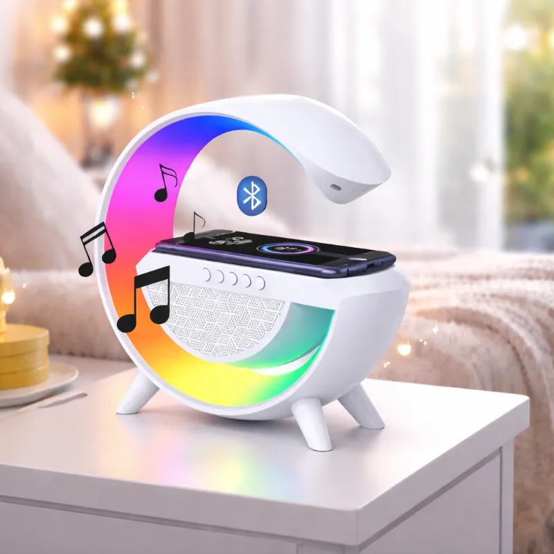 Funciones 6-en-1: Incluye altavoz Bluetooth, lámpara LED RGB con varios modos de luz, cargador inalámbrico rápido para teléfonos, radio FM, y reproductor de música mediante USB o tarjeta microSD.