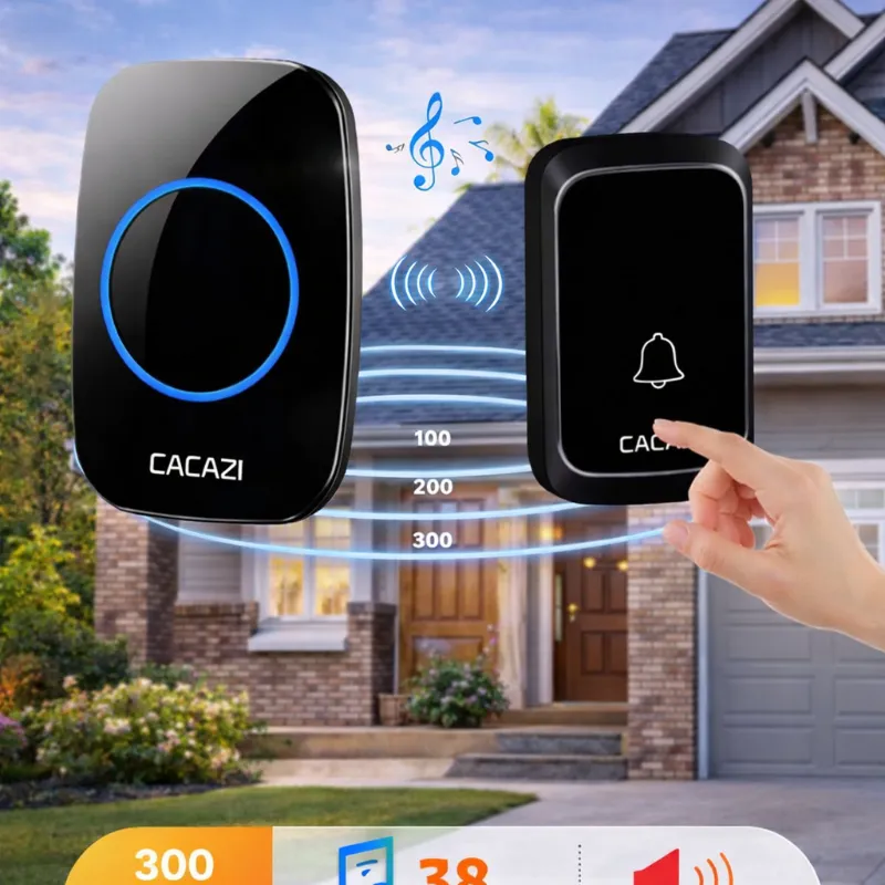 El artículo mostrado es el timbre inalámbrico CACAZI, un dispositivo de seguridad para el hogar diseñado para una instalación sencilla sin necesidad de cableado.