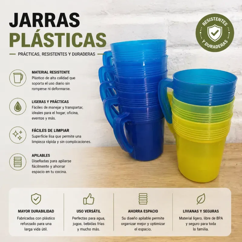 Jarras plásticas duraderas, útiles para cualquier tipo de bebida