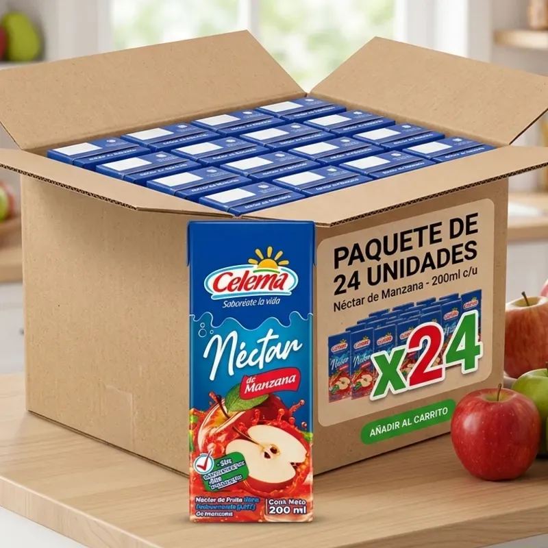 El producto de la imagen es el Néctar de Manzana Celema en su presentación de 200 ml, el cual se comercializa comúnmente en cajas de 24 unidades